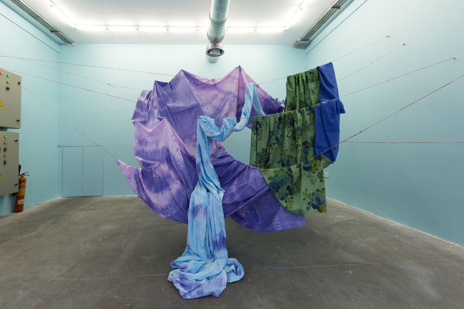Dastan is pleased to present Leila Seyedzadeh’s installation titled “Suspended Mountain” at Electric Room from August 4 to 9, 2017. The installation consists a series of hand-dyed fabrics hanged and suspended in the space shaping mountain-like forms and “creating a landscape in an interior”.